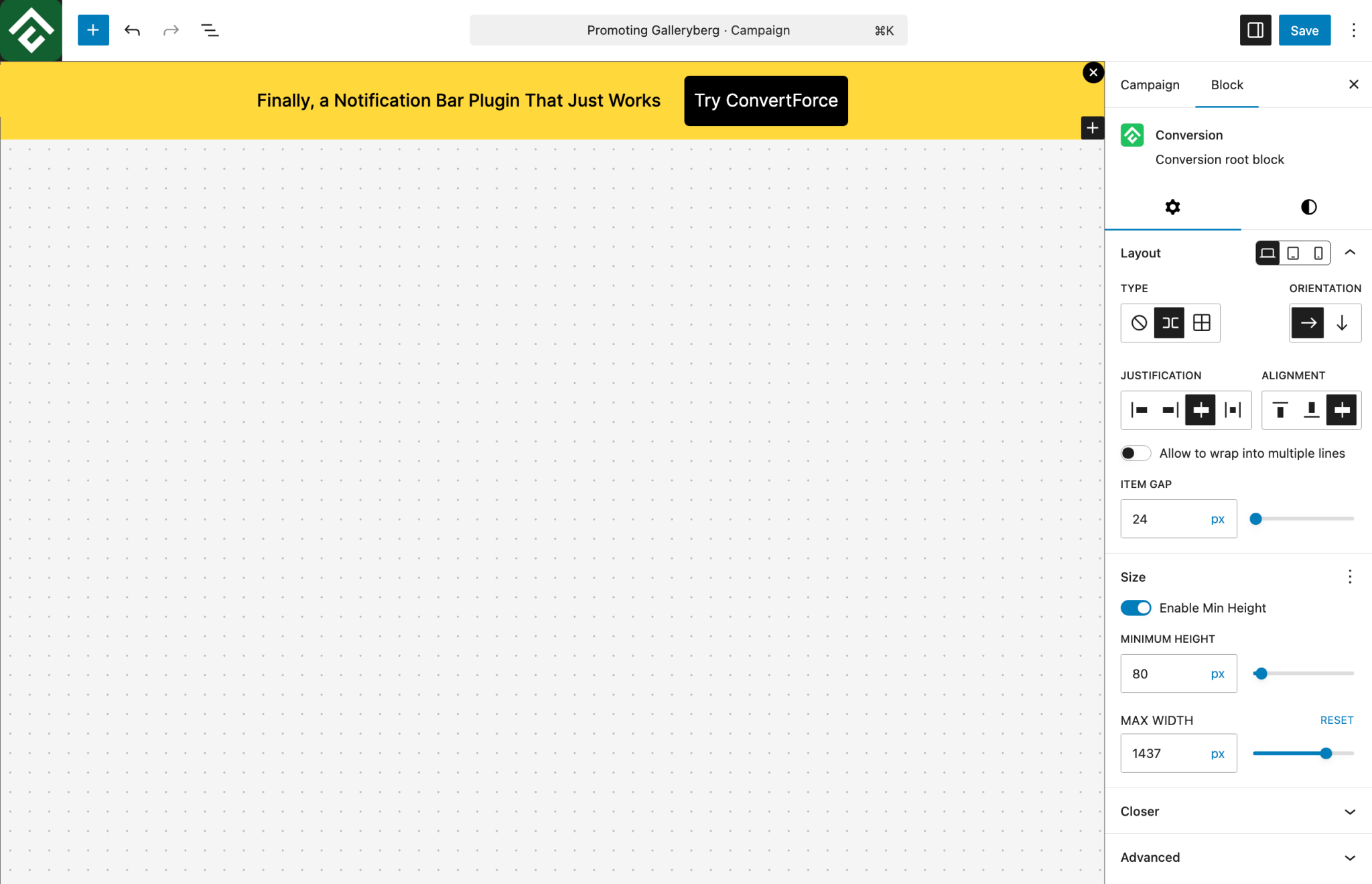 Instead of a separate settings screen, ConvertForce lets you design your notification bars using the same block editor you already use for posts and pages. That means you can add buttons, adjust typography, change colors, and style your bar using blocks you already know.
