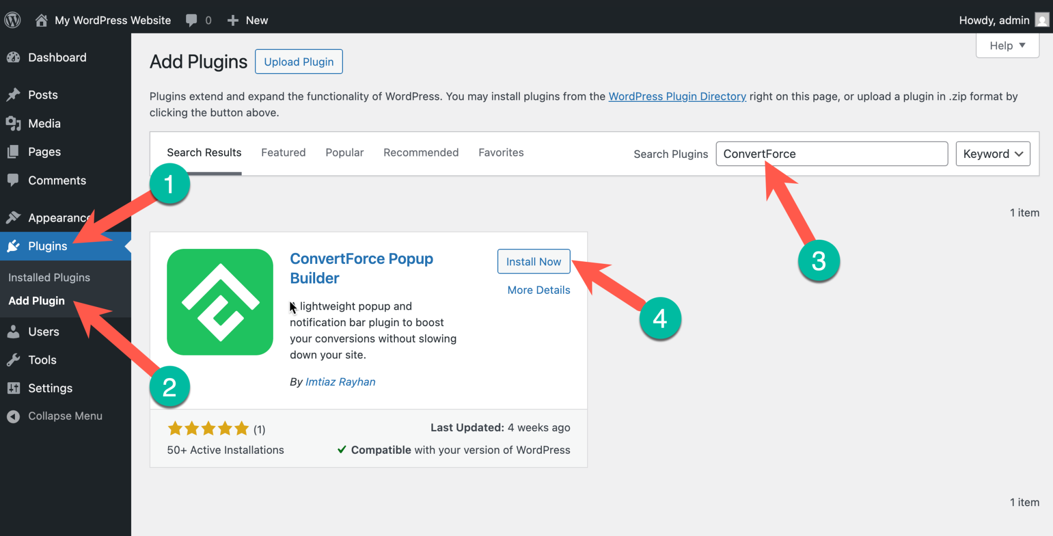 Here’s how to install the ConvertForce plugin. (Go to Dashboard → Plugins → Add New → Search for ConvertForce → Install & Activate the Plugin)